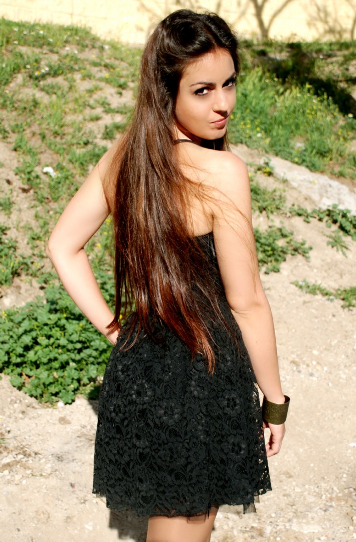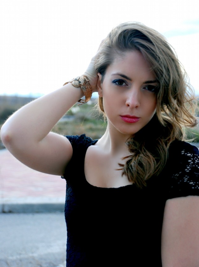 Elegante y sofisticado vestido de Encaje de BERSHKA (25.99€) enmarca un look misterioso y onírico a través de un Brazalete en forma de lechuza. La modelo acompaña el Total Look con un bolso Louis Vuitton (consultar precio)