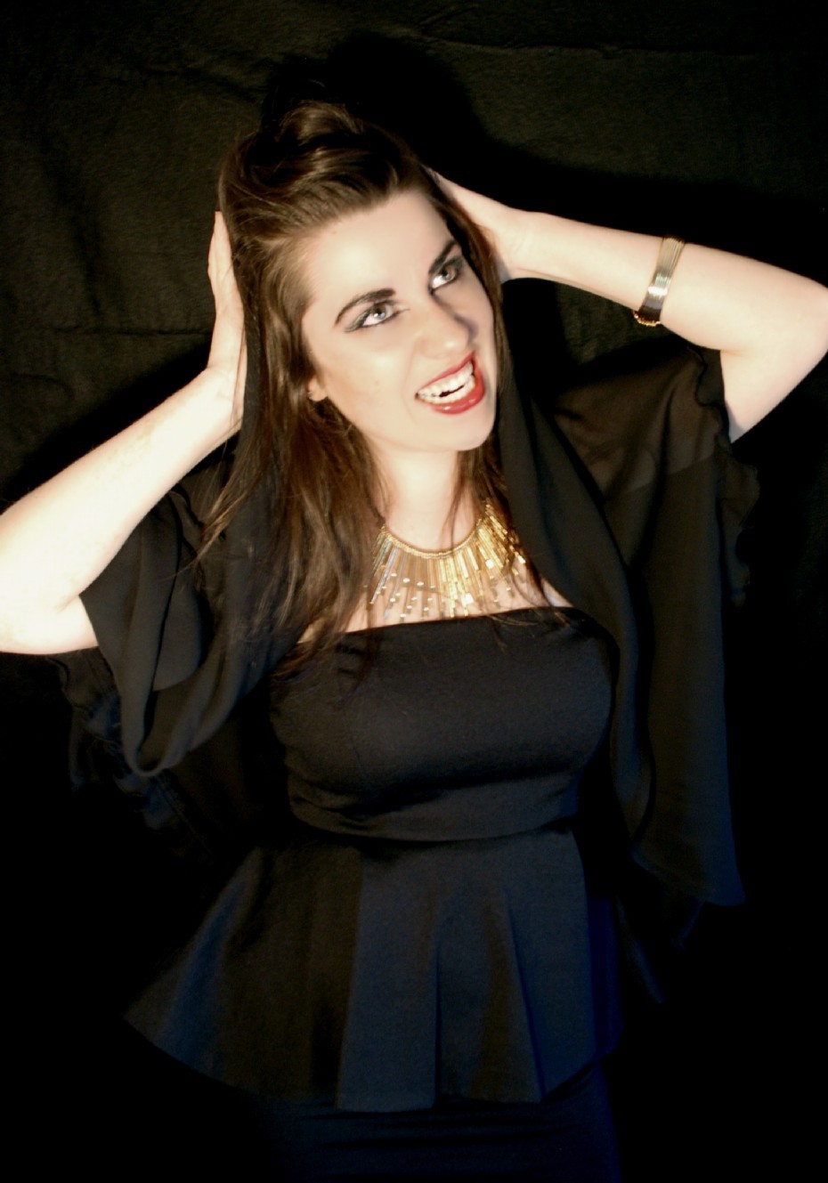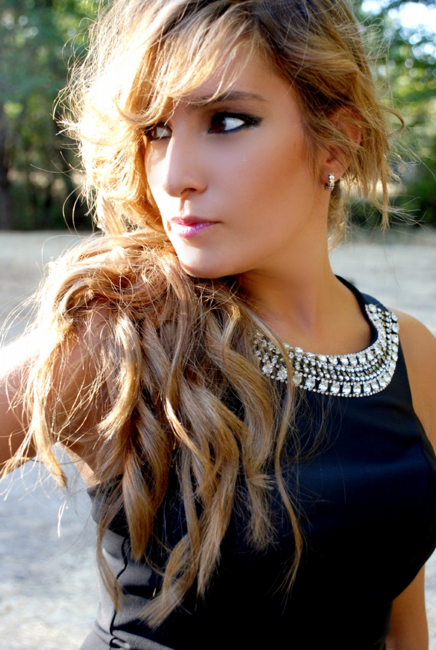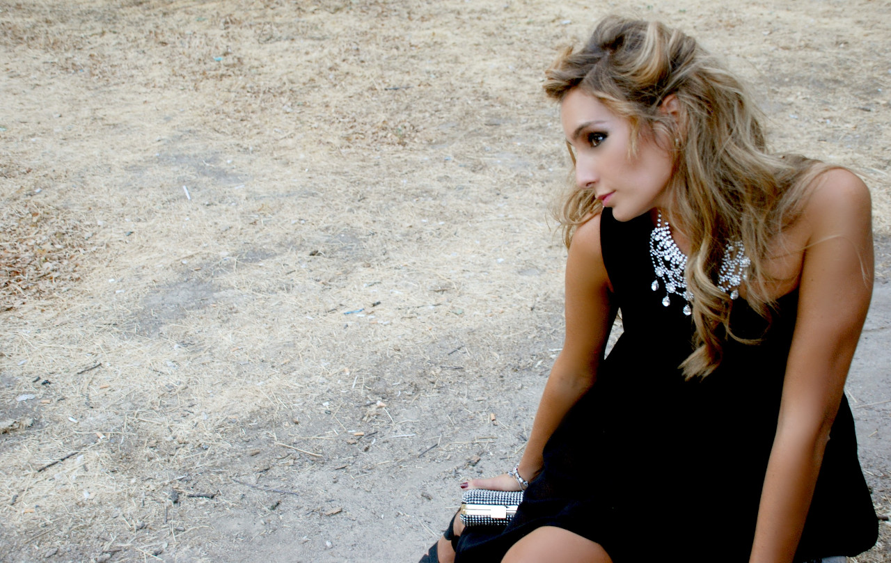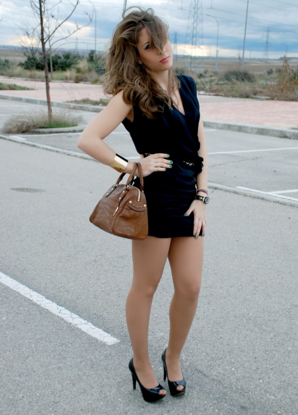 La modelo lleva un black dress de MANGO (45.99€), Cinturón trenzado dorado y negro de ZARA (15.95€), Bolso bowling de MICHAEL KORS (consultar precio) y Pulsera brazalete vintage