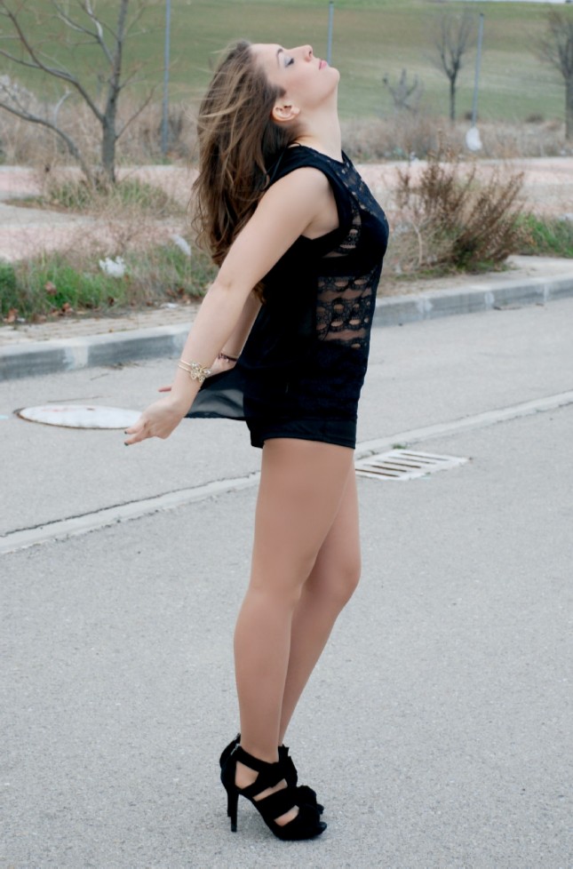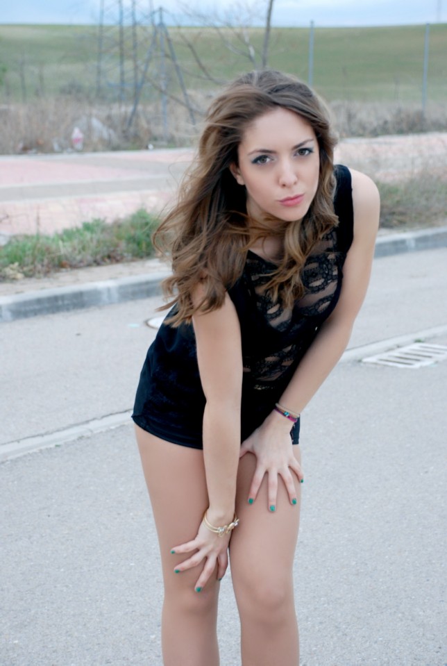 En un sensual coordinado de tejidos, la modelo viste un Short satinado de ZARA (7.99€), Camiseta de encaje con motivos florales (25.95€) y Complementos de Bijou Brigitte