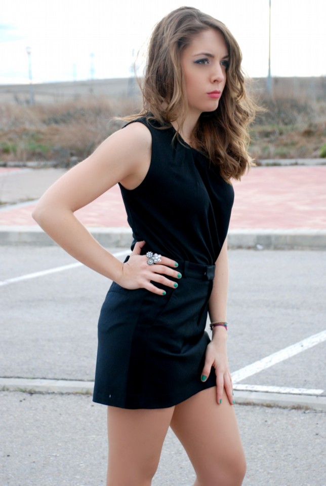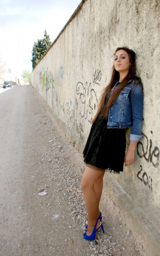 Sexi y actual, el primer coordinado se compone de un Vestido negro de encaje palabra de honor y falda de media capa con interior en tull negro, de BERSHKA (25.99€). Se enriquece mediante una Cazadora vaquera de STRADIVARIUS (29.95€) y unos Zapatos destalonados en azul pavo real también de STRADIVARIUS (35.95€). El detalle final se basa en una pulsera brazalete con detalles florales labrados.