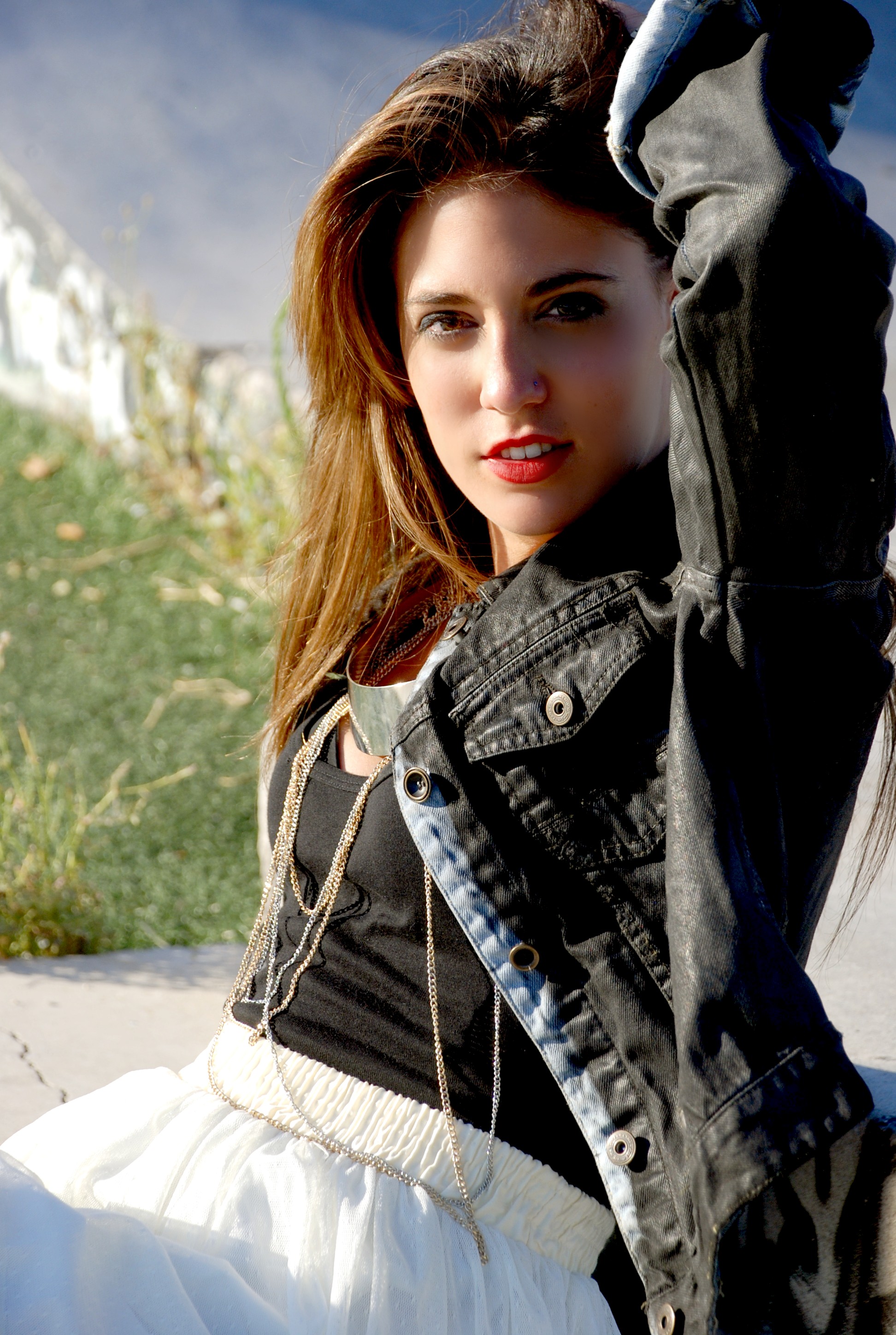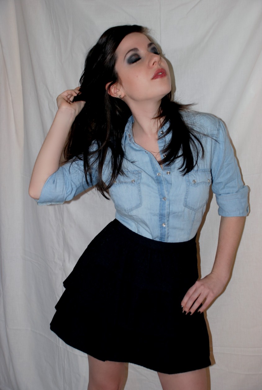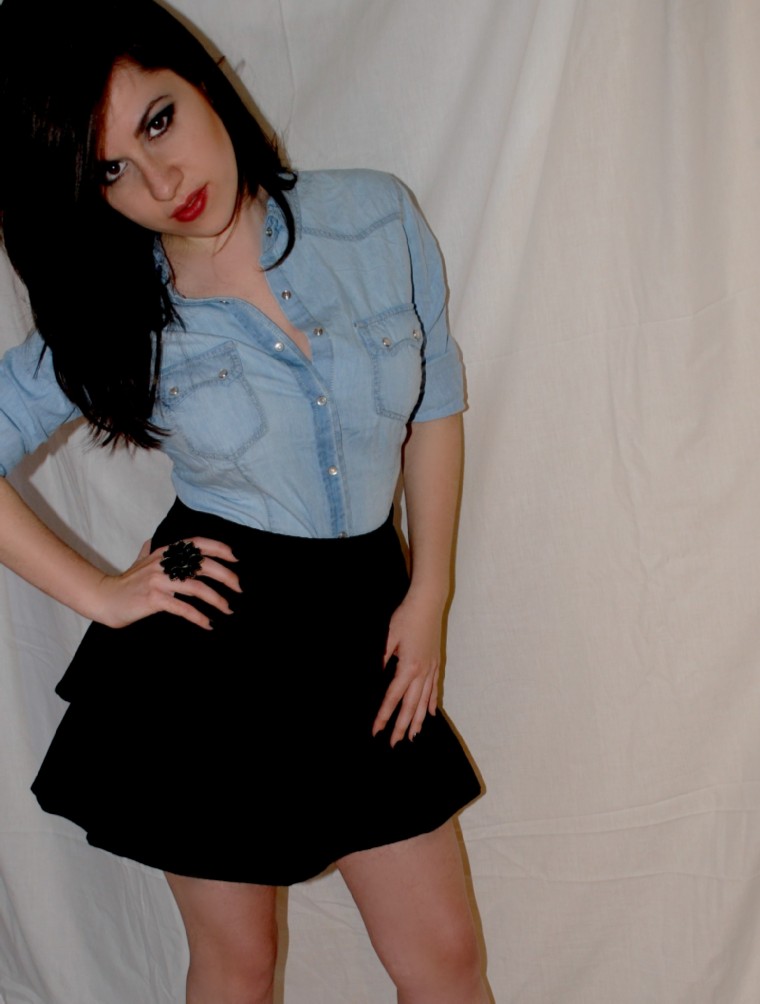 Dentro de la más canónica tendencia de moda, la modelo lleva una Camisa Vaquera de STRADIVARIUS (19.95€) y una Falda peplo de encaje negro. El estilismo se enriquece a través de un Anillo de tipología dark.