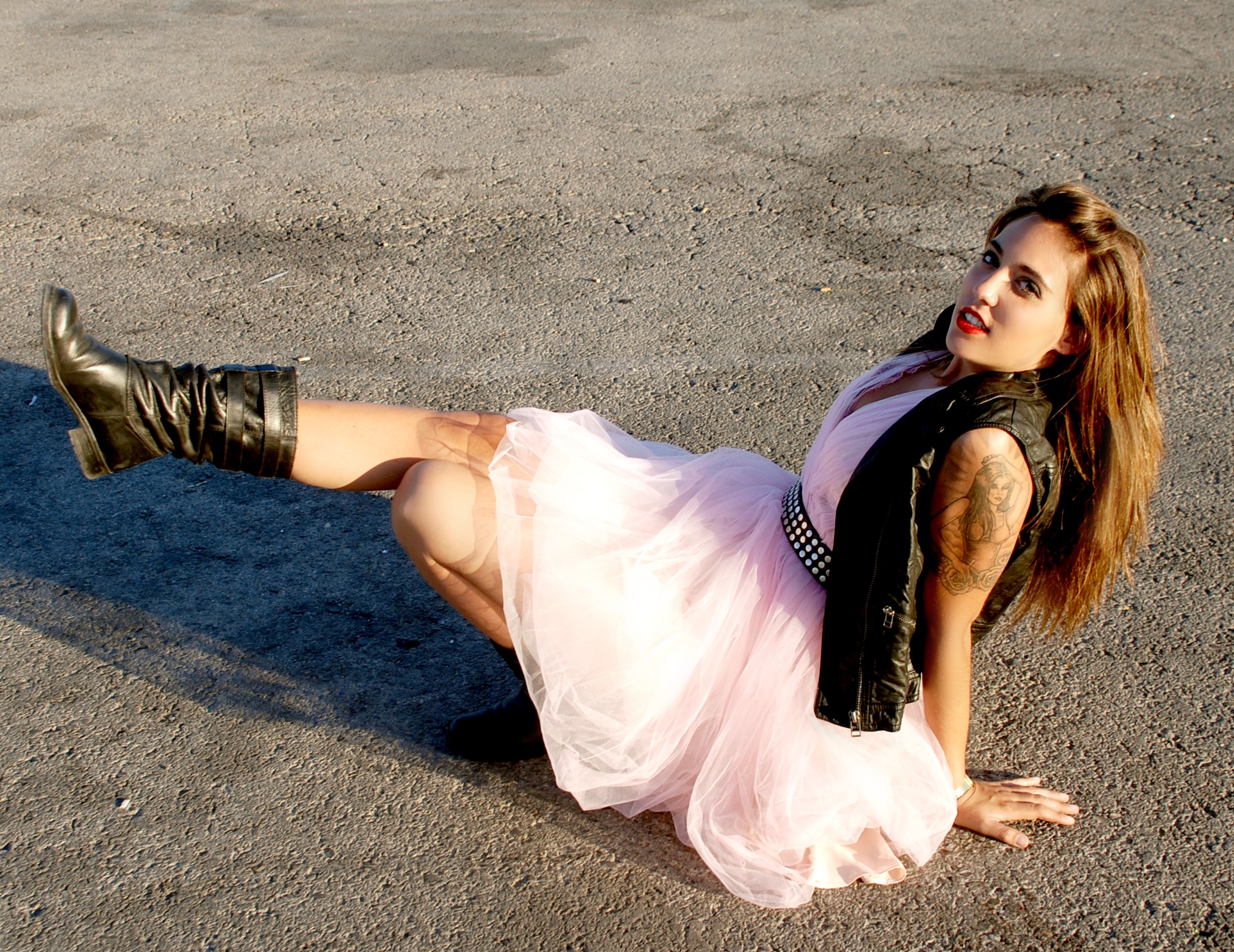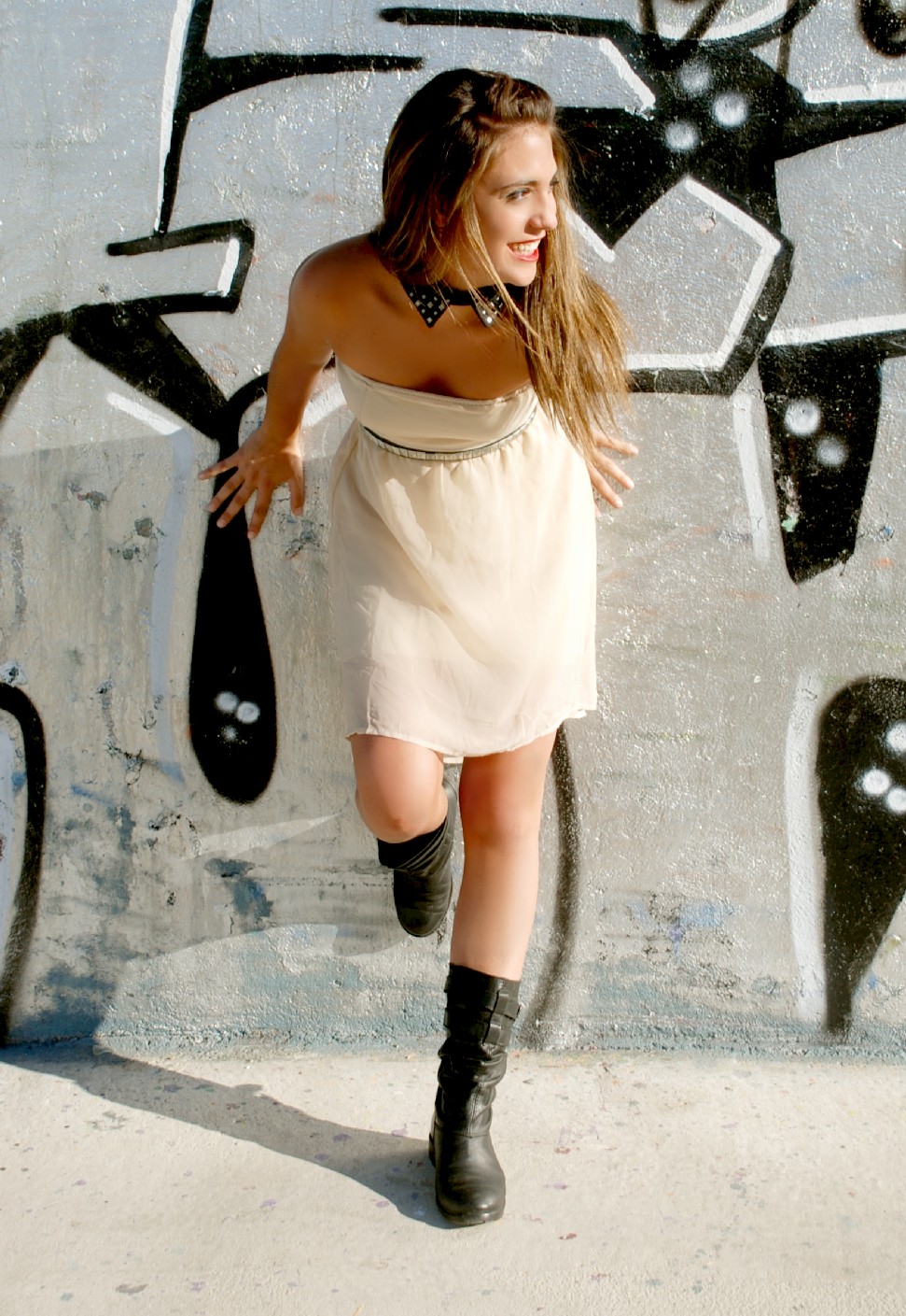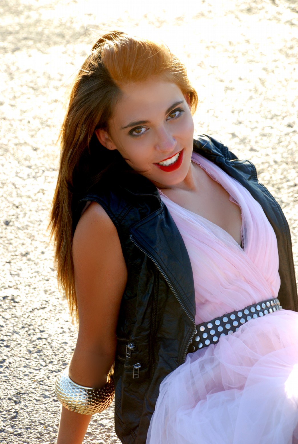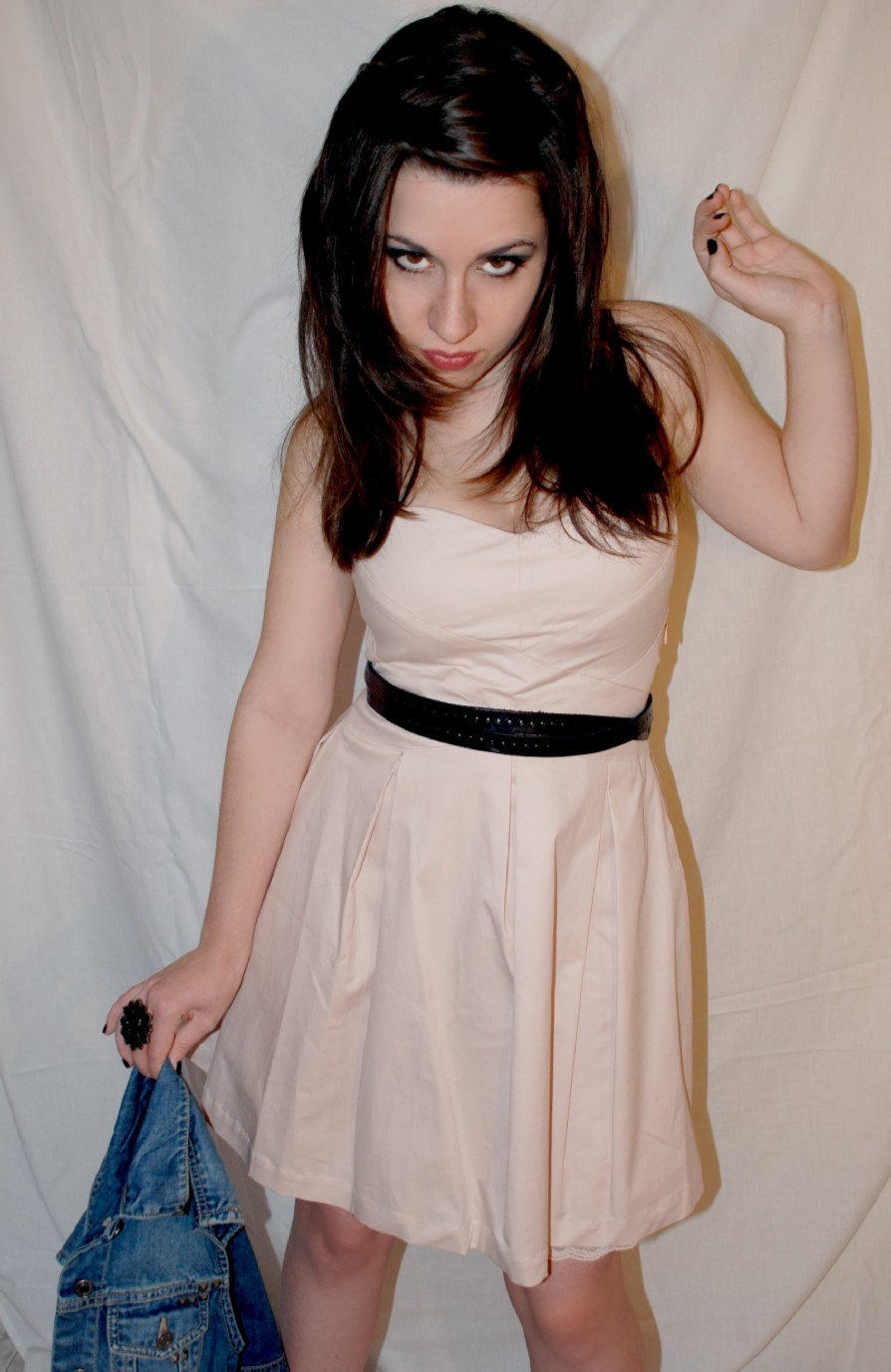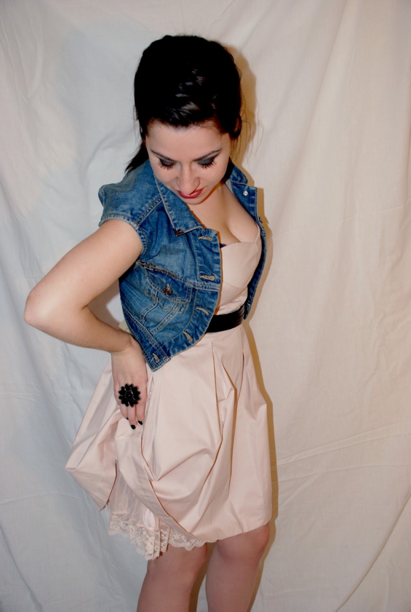 Una moderna Cenicienta surge en este estilismo mediante la ruptura de los cánones clásicos de un Vestido de cocktail de escote corazón y color nude de BERSHKA (25.95€). Chaleco Vaquero con detalles de tachuelas de PULL&BEAR (22.99€), Cinturón de piel negro de ZARA (15.95€) y Cuñas en ante negro de STRADIVARIUS (55.95€) terminan de aportar el aire rockero a la princesa de cuento en este coordinado.