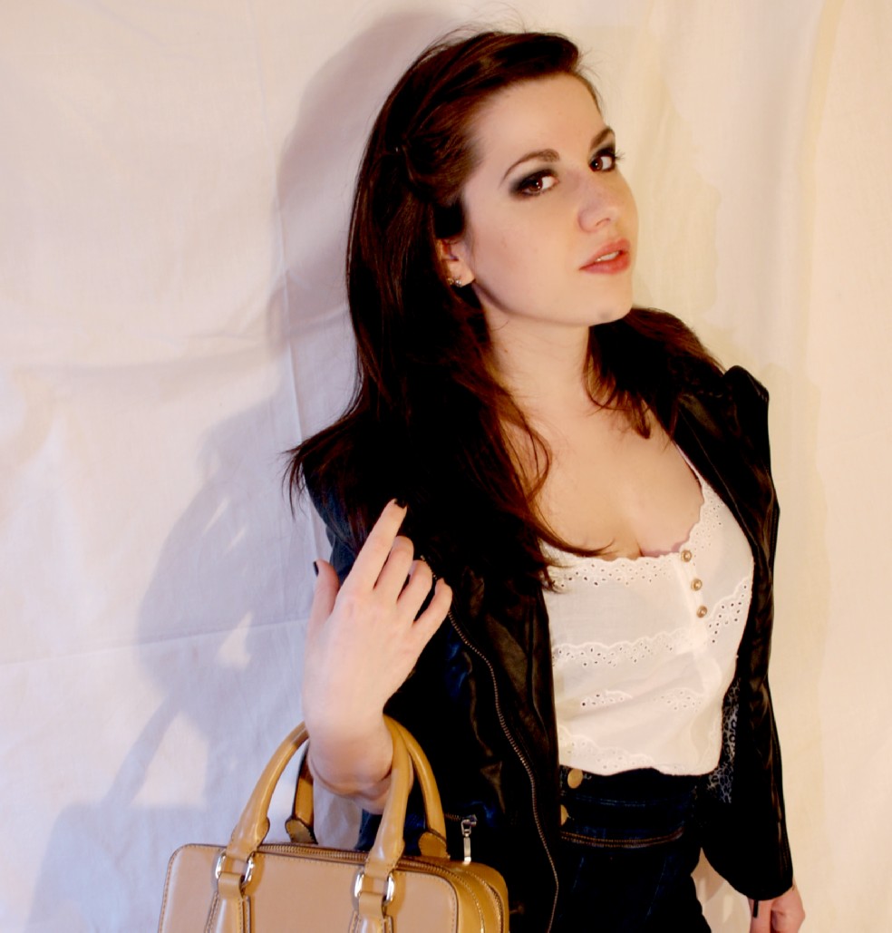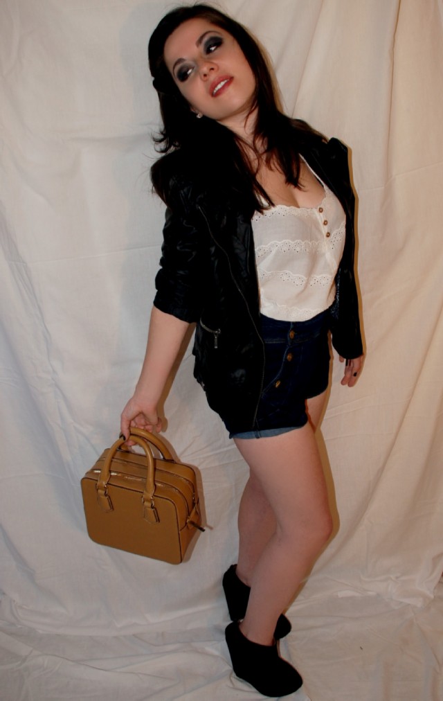 Simbiosis de mujer rocker y pin up girl se crea un coordinador compuesto de un Short vaquero de cintura alta de PULL&BEAR (22.99€) y un Cuerpo sin mangas de reminiscencias lenceras en color crudo de BERSHKA (17.99€). Este estilismo se endurece a través de una Perfecto negra en polipiel de ZARA (39.95€) y unas cuñas negras en antelina de STRADIVARIUS (55.95€). La modelo lleva un Bolso de estilo maletín en color camel de ZARA 35.95€).