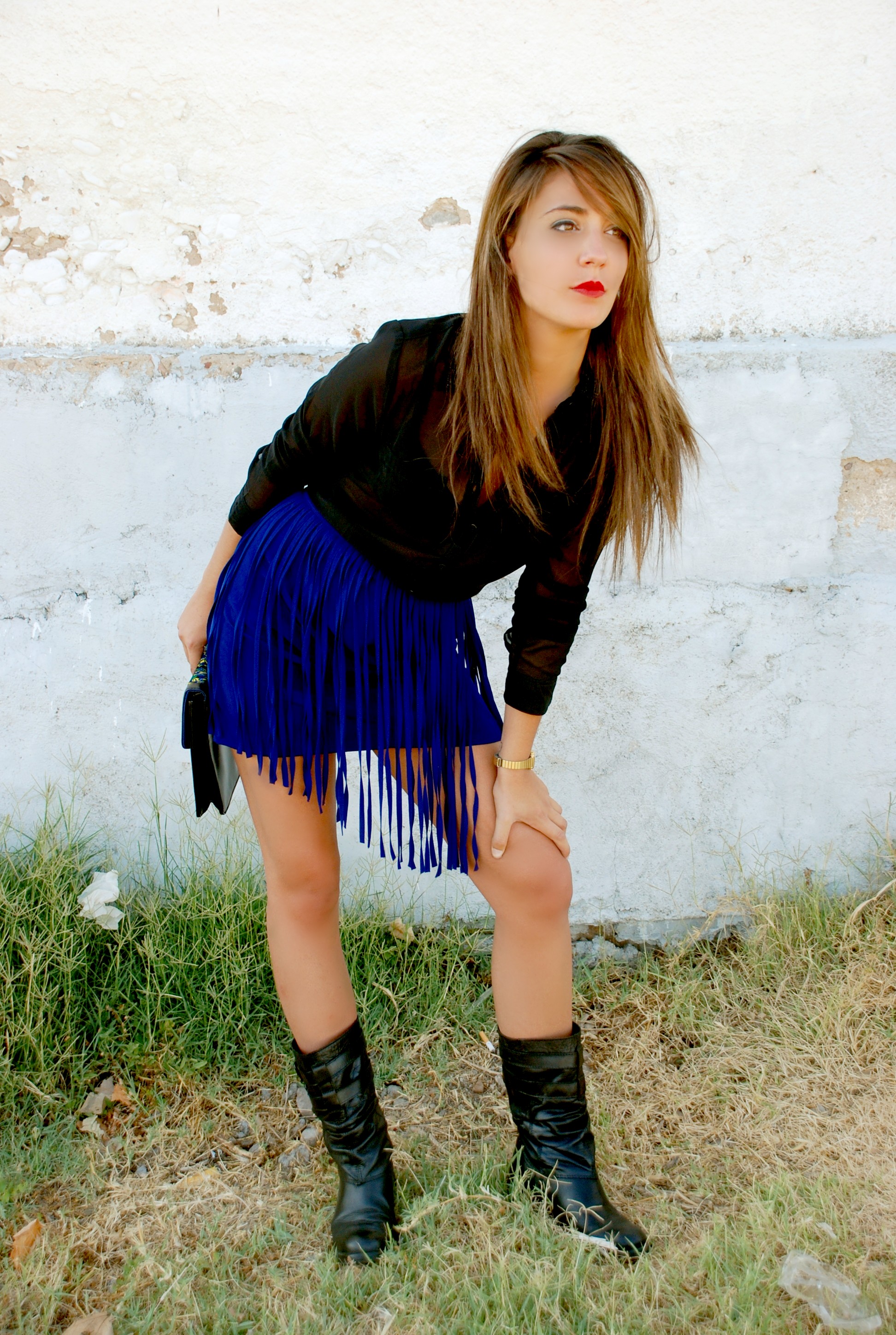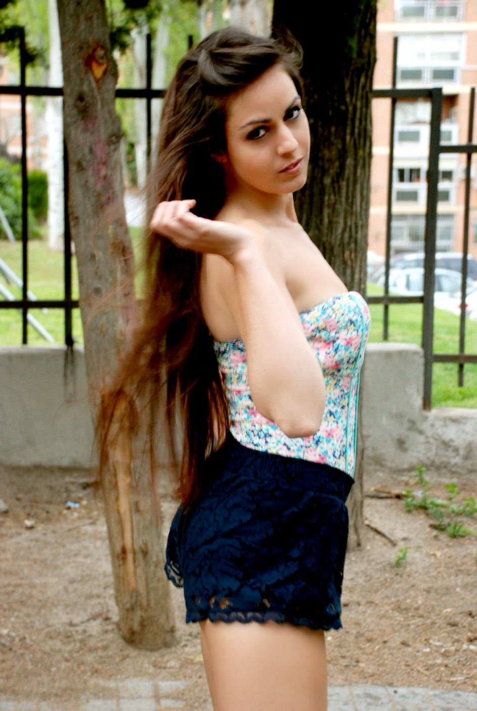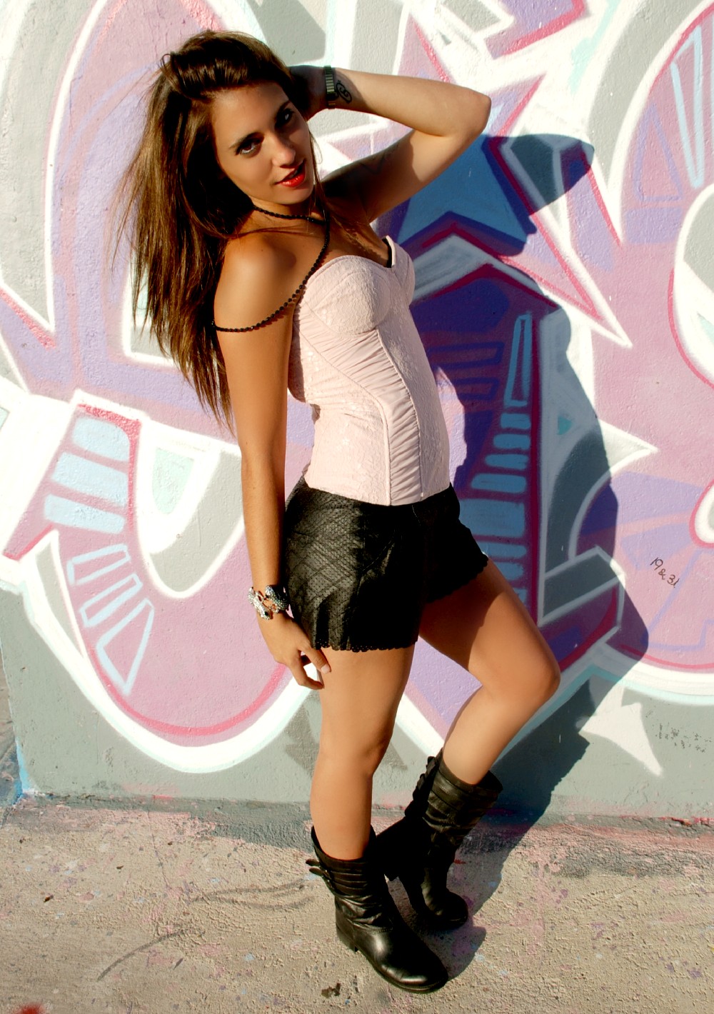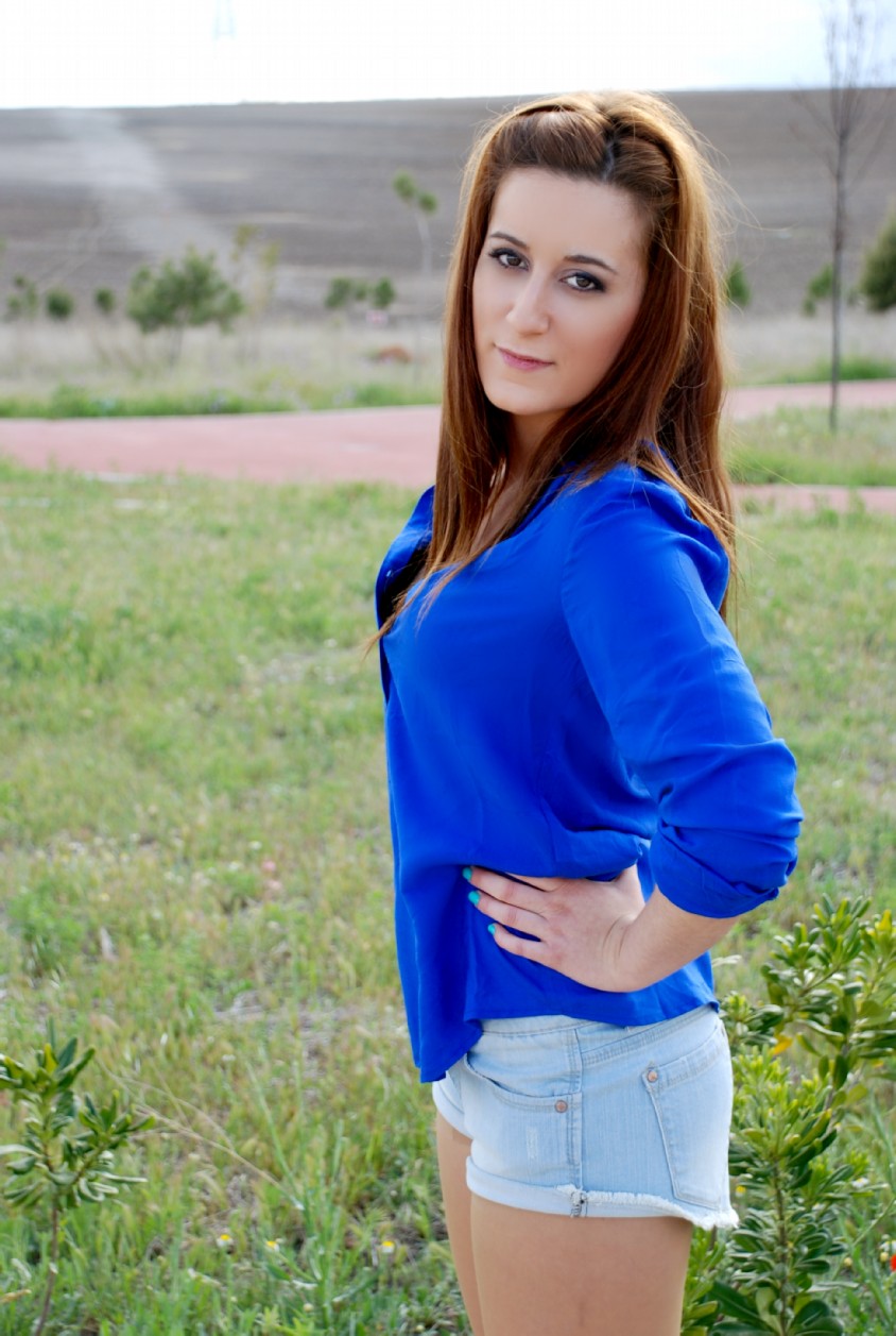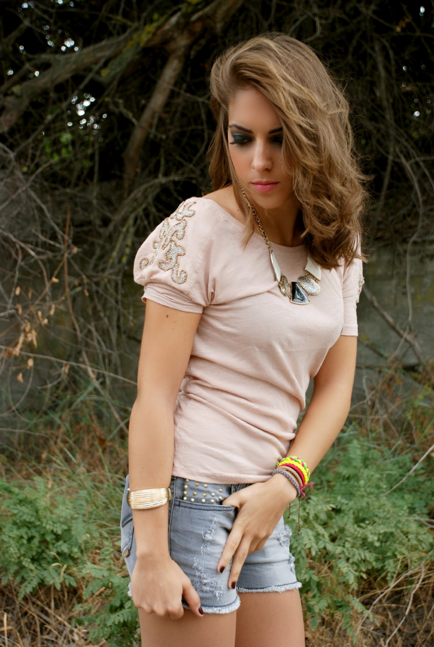 Sexi, atrevido y de sensualidad imperecedera, la modelo lleva un coordinador a base de Short de encaje fucsia de H&M (12.95€) y Camisa de gasa azul con detalle delantero de MANGO (17.99€). Complementos metálicos como el Cinturón de MANGO (15.99€) y la pulsera ennoblecen el conjunto.