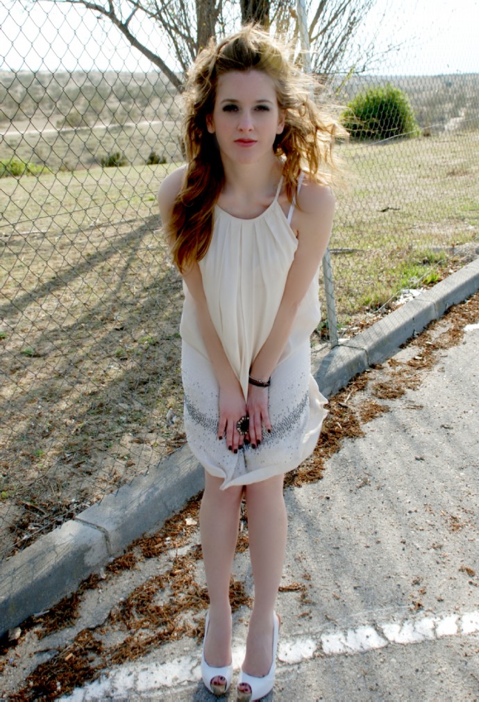 Estilismo romántico y elegante basado en un Vestido-Túnica de cuello halter con pailletes inferiores en blanco roto, de MANGO (99.99€). Los complementos sencillos y concordantes con la tipología del vestido, se basan en Sandalias peeptoe de plataforma plateada, de ZARA (49.95€), y anillo en plata y pedrería.