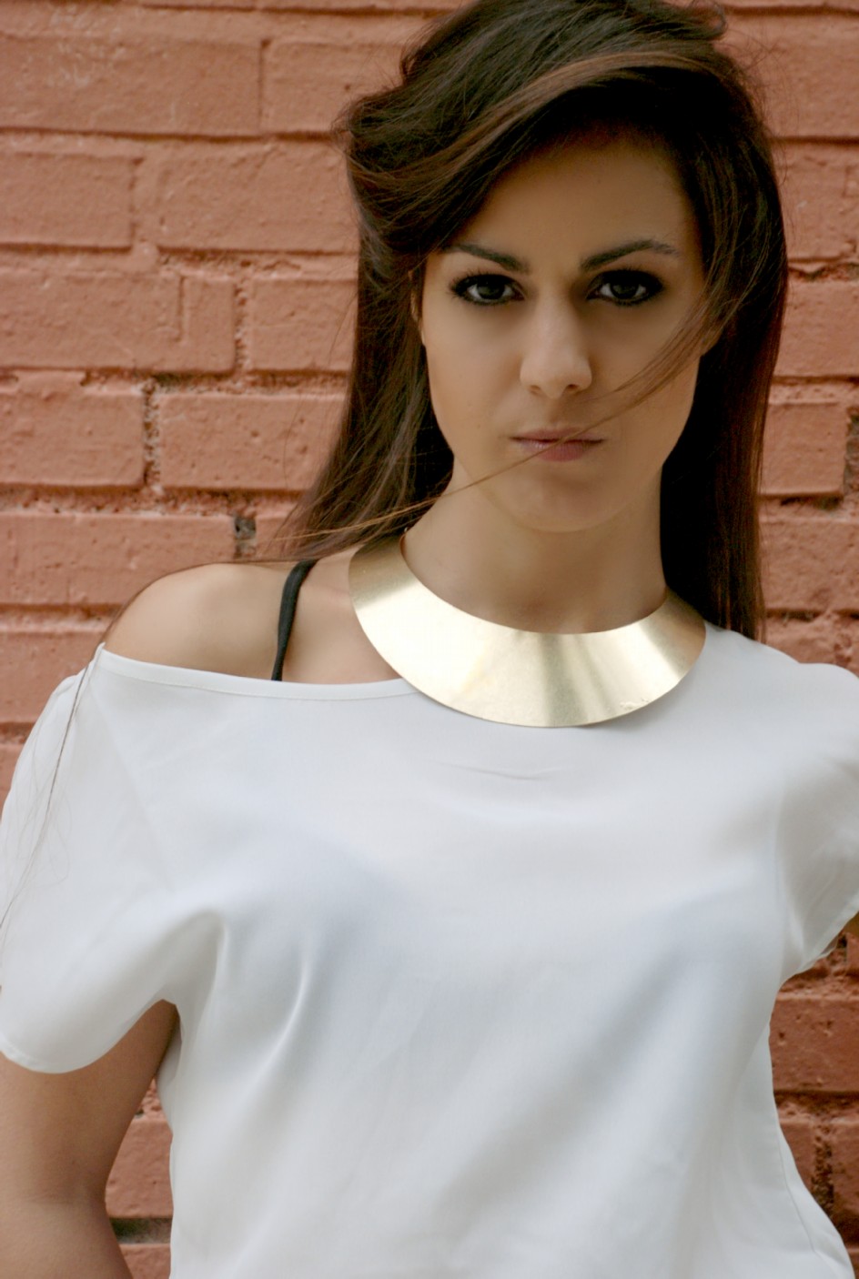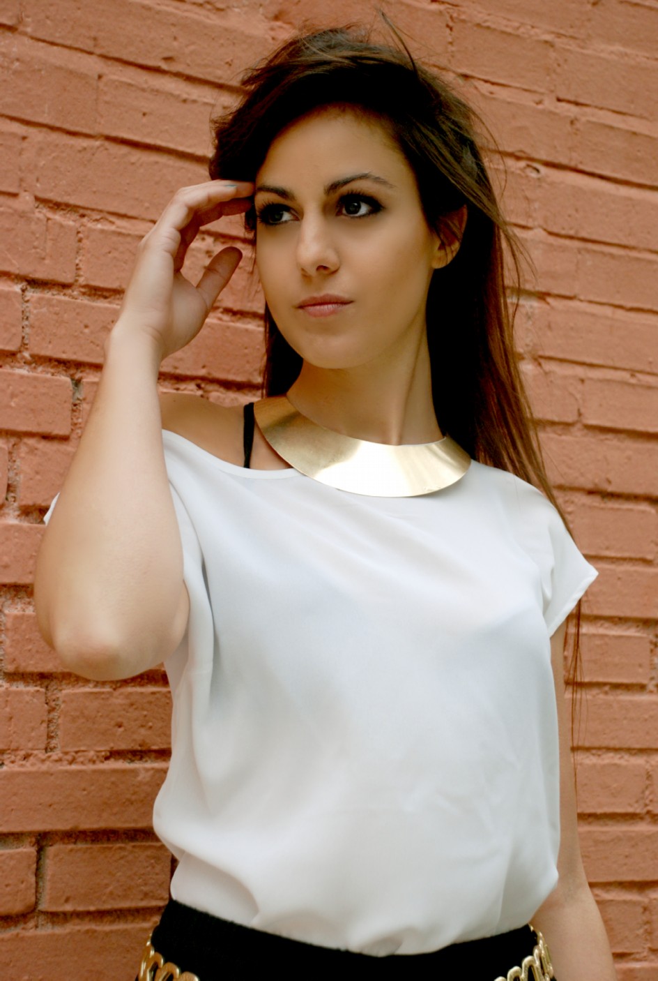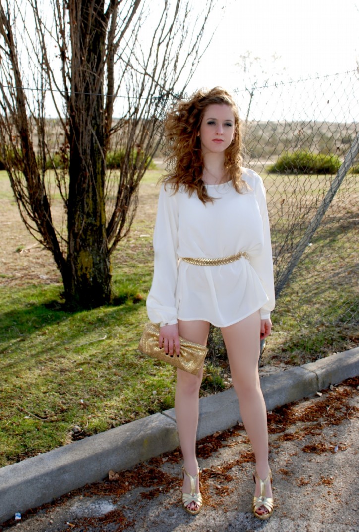 Finalmente un estilismo basado en la pureza y elegancia del blanco, se reinventa mediante aires griegos a través de un coordinado sexi, elegante y audaz. La modelo lleva una camisa oversize en satén blanco de LEFTIES (15.99€) que se acrecienta mediante la proliferación de complementos dorados, principalmente un Cinturón metálico de STRADIVARIUS (12.95€).