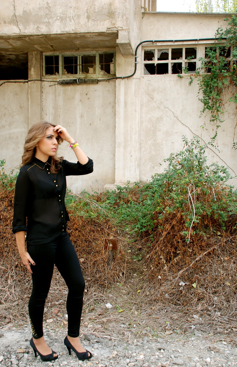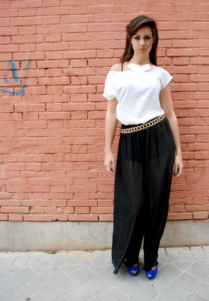 Rejuveneciendo la estética griega, este estilismo se basa en un Pantalón de gasa negra y pata de elefante, de Zara (25.95€); y una Camisa de gasa blanca desestructurada de BLANCO (9.99€). Los complementos en tono dorado, como la Gargantilla de BLANCO (12.99€) y el Cinturón de ZARA (17.95€), rompen su sobriedad mediante el colorido de los zapatos