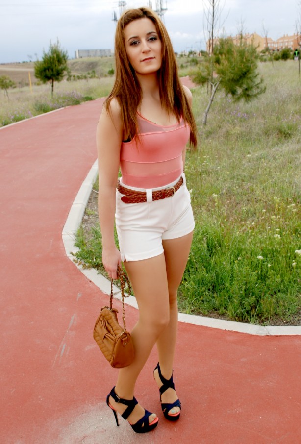 La mezcla de elementos de diversos materiales y tipologías conforman un todo unificador mediante un Body de algodón en color coral de BERSHKA (12.99€) y Short de cintura alta de H&M (19.95€). Los complementos en tonos camel insertan el coordinado en la actualidad de tendencias, así Bolso de BERSHKA (12.99€) y Cinturón de STRADIVARIUS (4.95€) juegan con la combinación de colores y texturas. Finalmente el detalle lo añaden las sandalias bicolores de BERSHKA 39.99€).