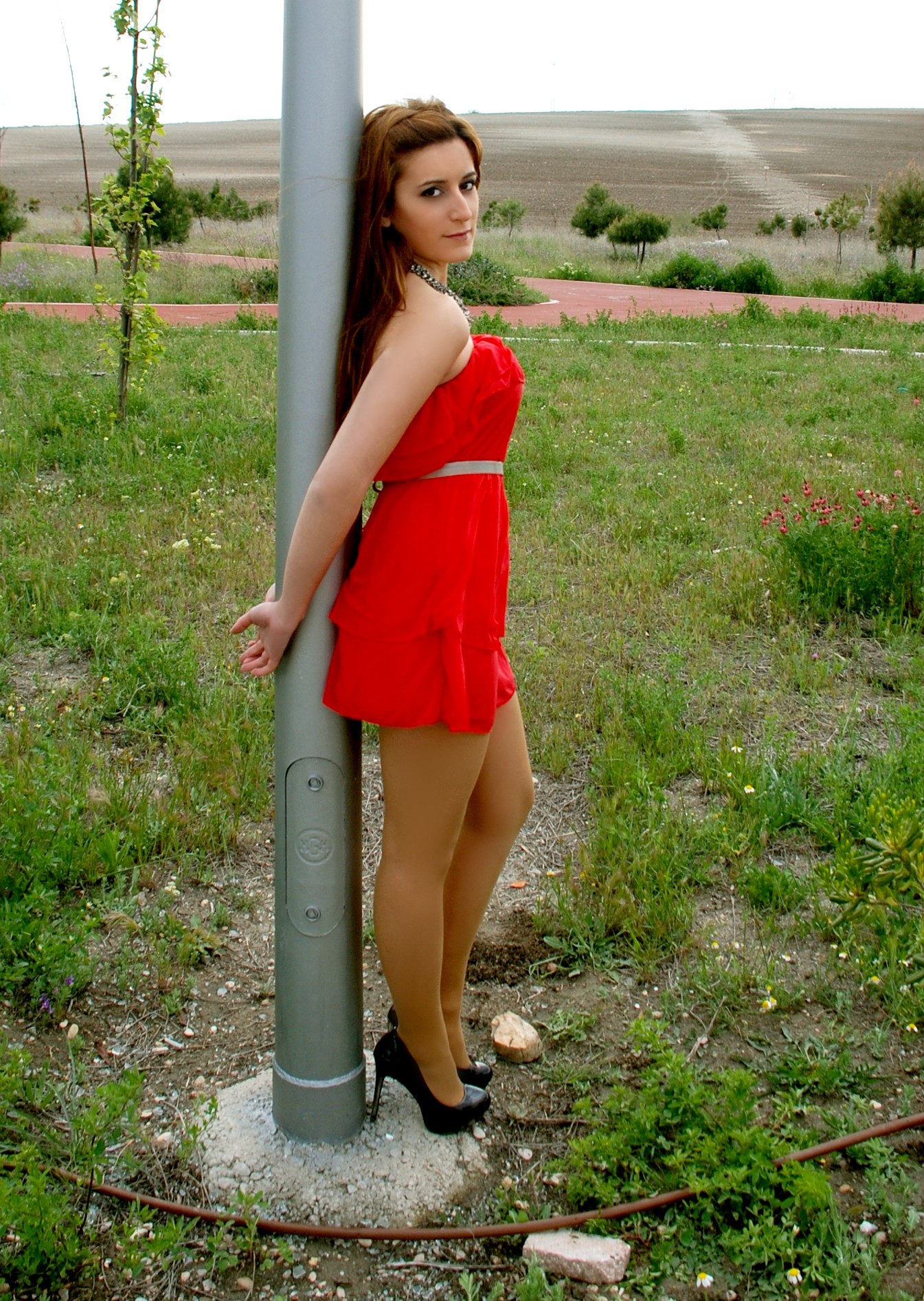 Porque la elegancia y la frescura no son elementos excluyentes, la modelo lleva un Vestido de cuello halter y superposición de capas en color coral, de ZARA (39.95€).