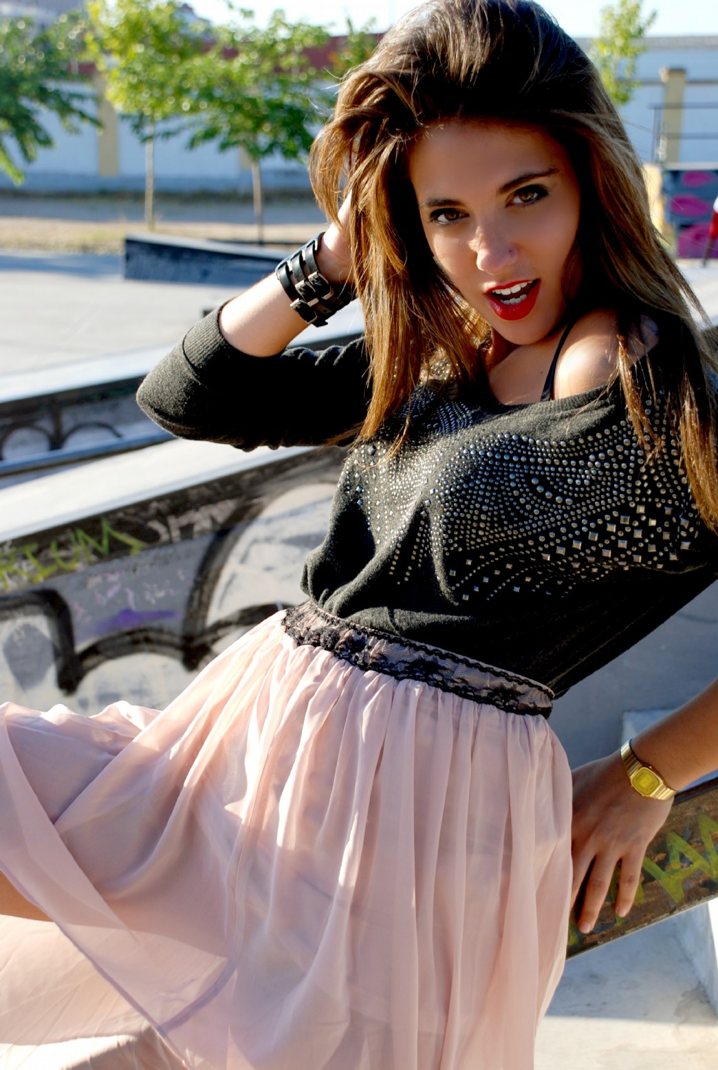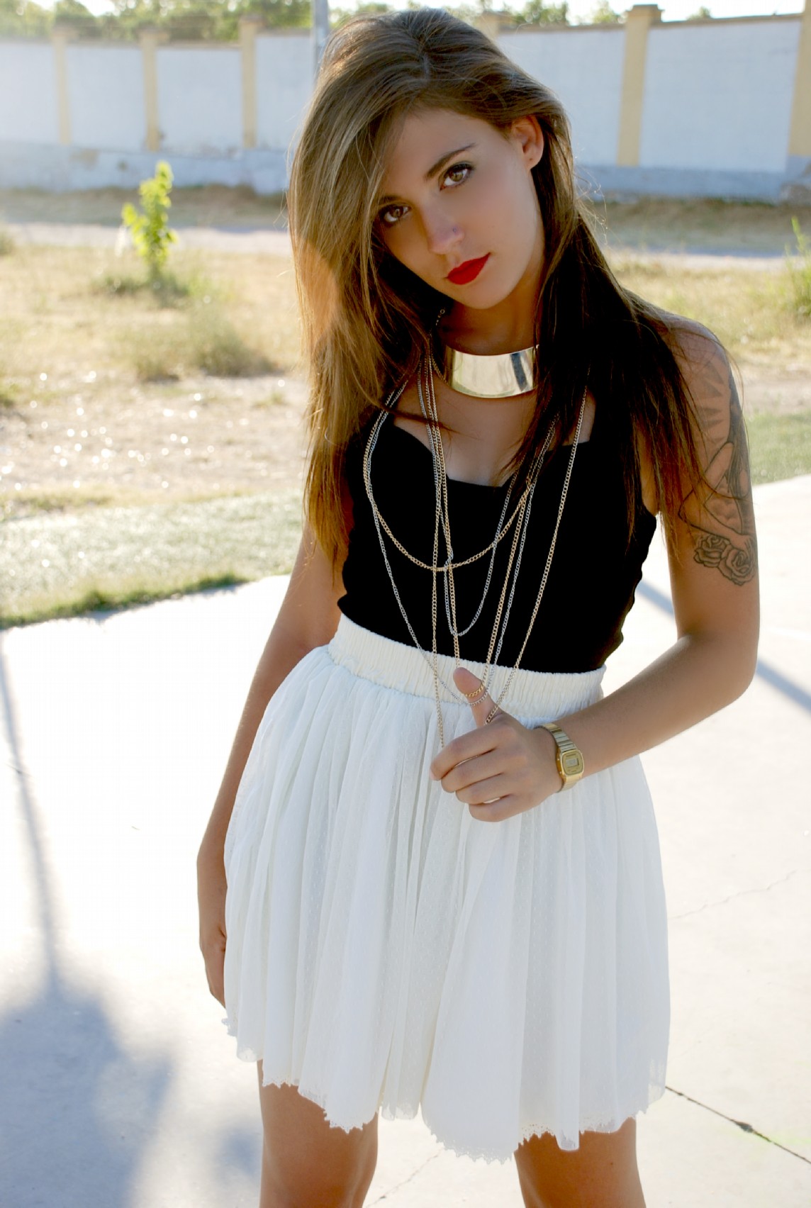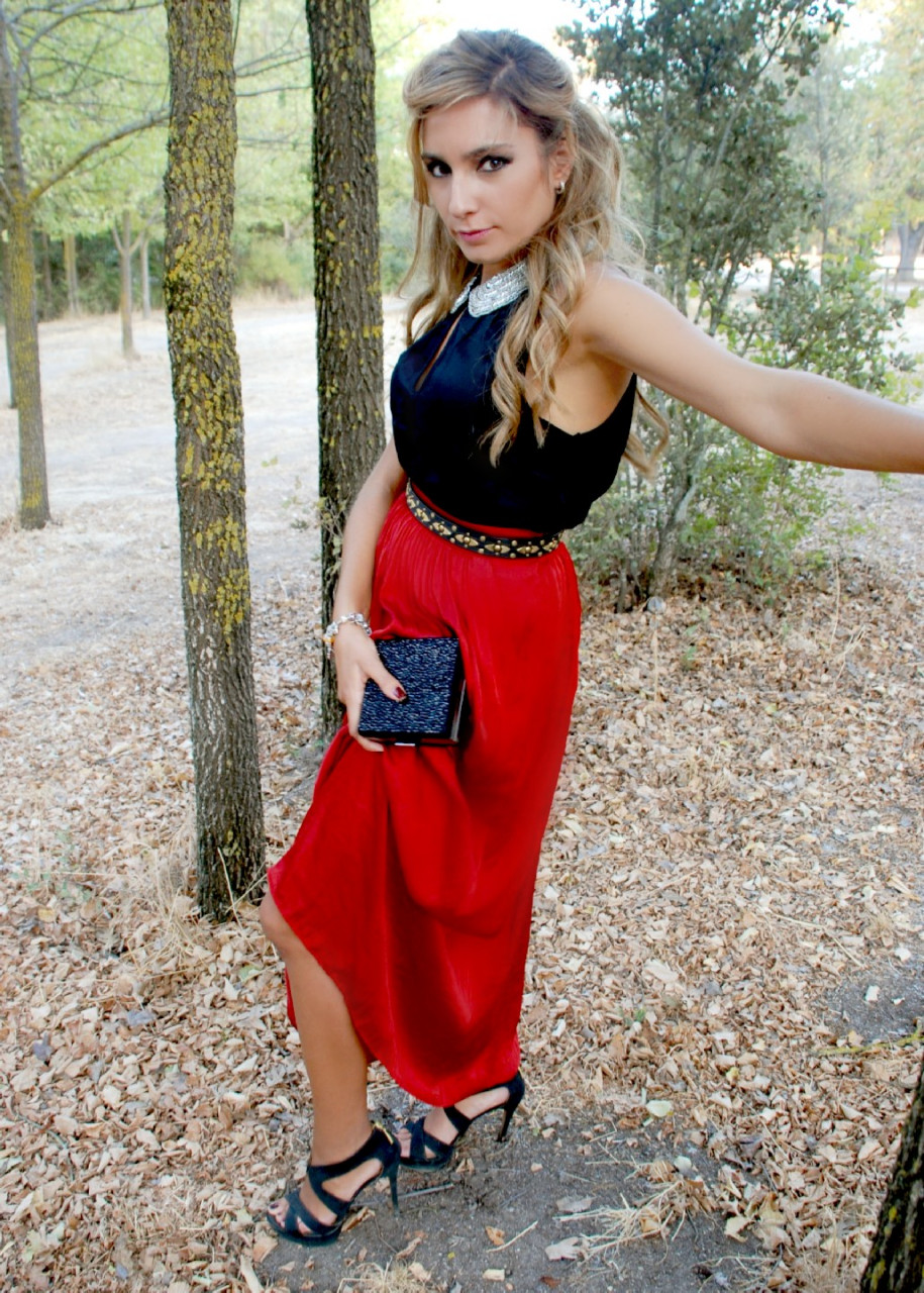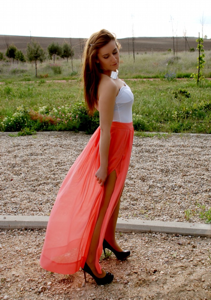 Elegante y especialmente rompedor, aparece una combinación de Body de BERSHKA (9.99€) y Falda de gasa color coral de ZARA (39.95€). Elegante y romántico conjunto que es endurecido mediante un Cuello-Pectoral de H&M (9.95€).