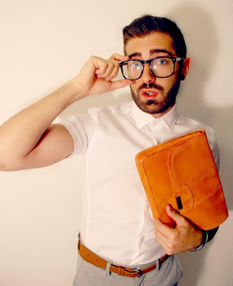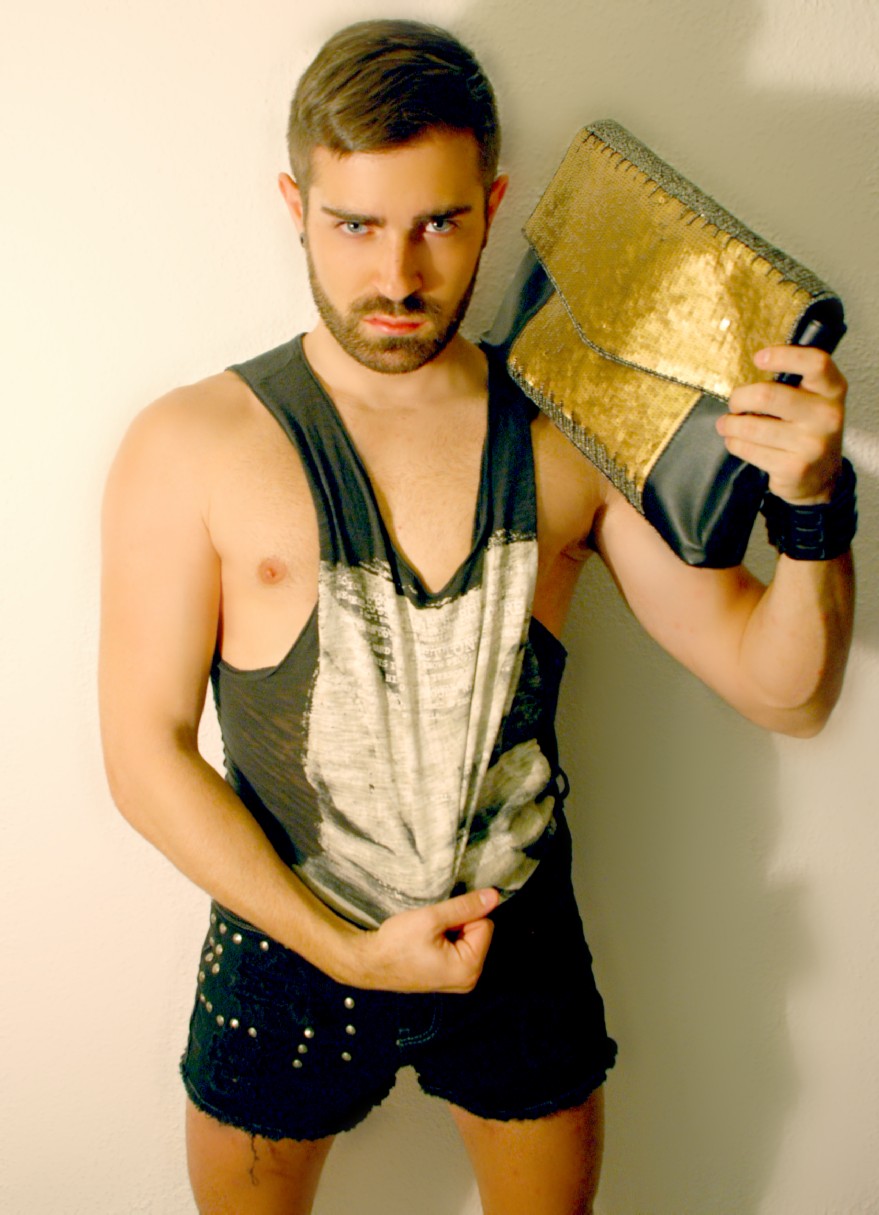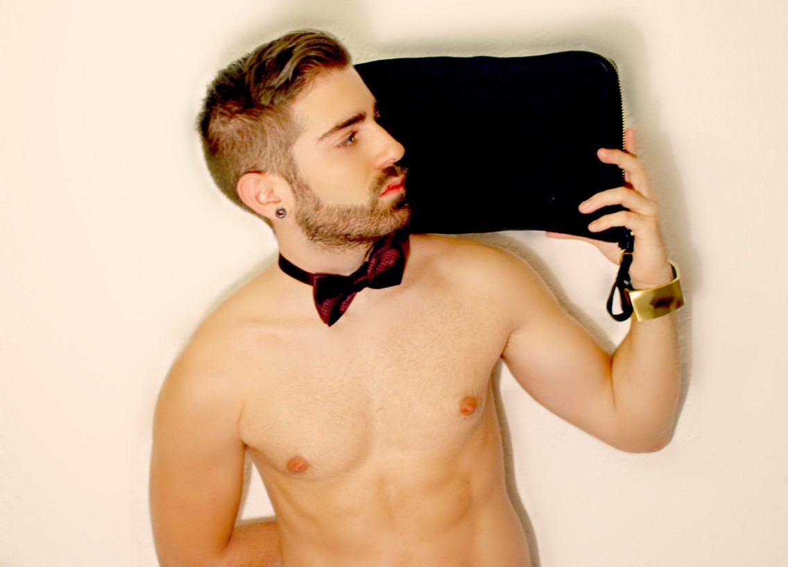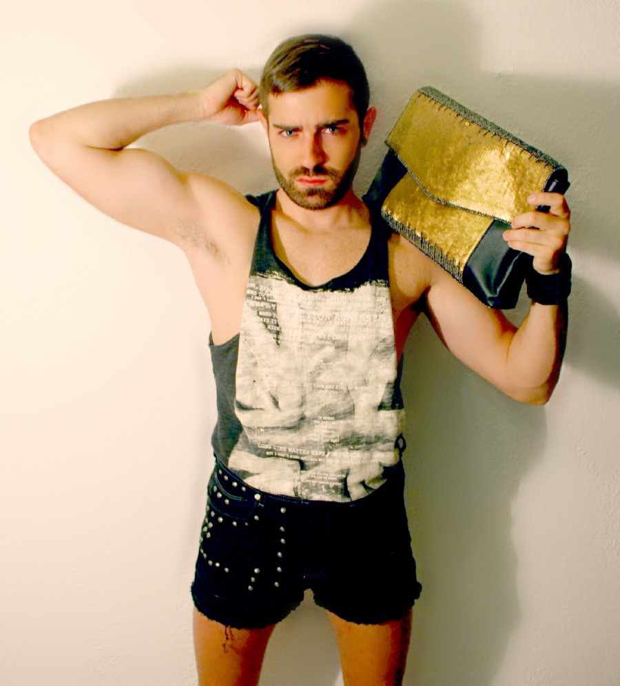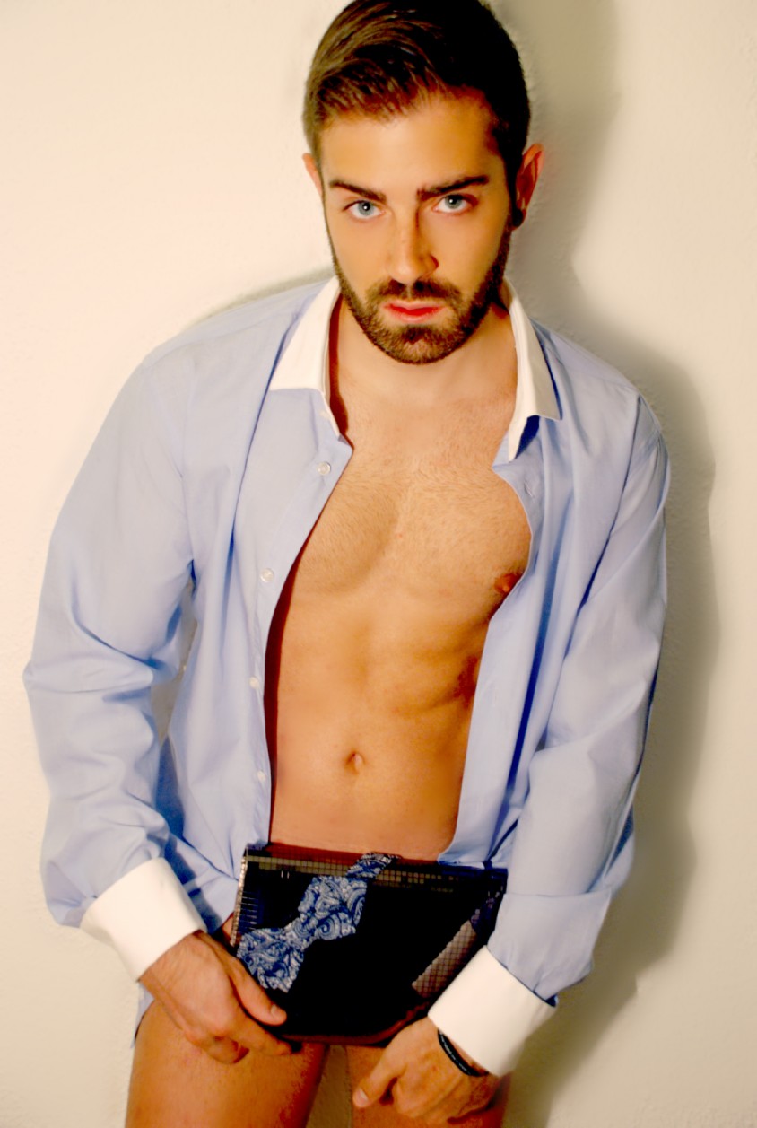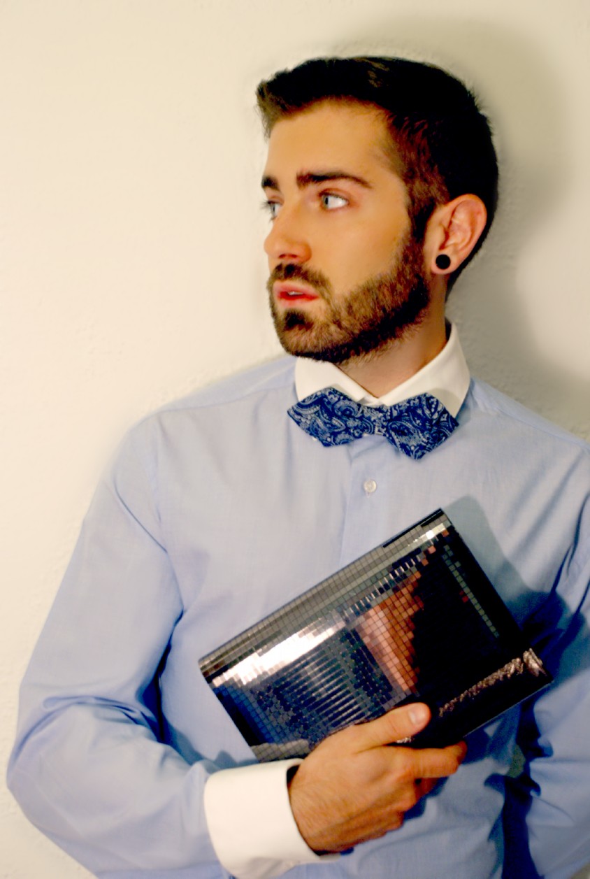 La dualidad masculino-femenino se rompe de forma abrupta mediante la combinación de dos tipologías tan diferentes como las que lleva el modelo. Camisa clásica de cuello y puños blancos de ZARA (C.P.V) y Pajarita de estampado cachemir también de ZARA (12.95€) se combinan con una Cartera de Mano de teselas brillantes de MANGO (25.99€).