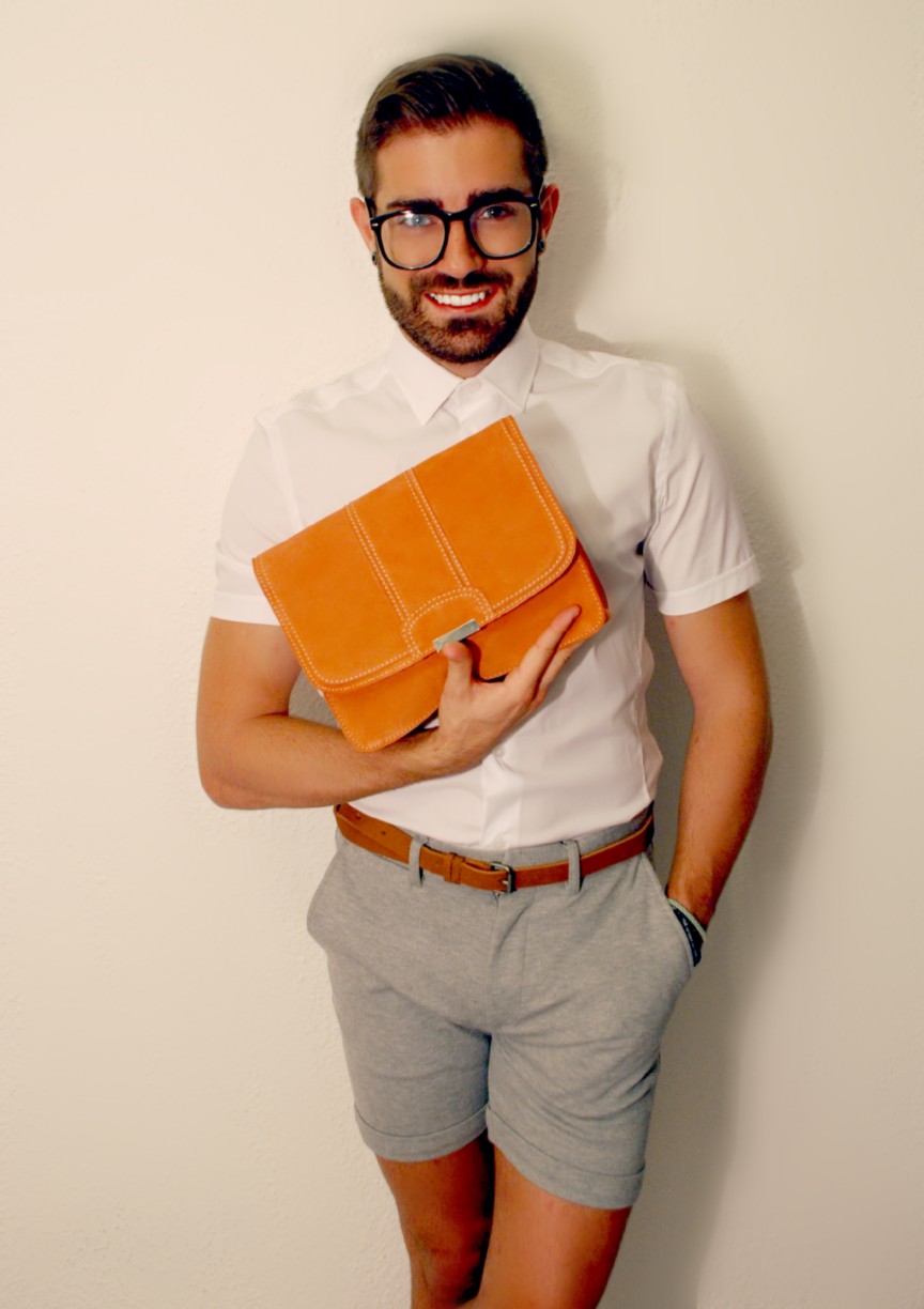 Deconstruyendo el concepto de masculinidad aparece un estilismo de reminiscencias a las tendencias de los estadounidenses años 60 mediante Camisa blanca de manga corta (29.95€) y Bermudas en felpa gris (25.95€) ambos de ZARA, que se combinan con un Bolso bandolera en color melocotón de MANGO (59.99€).